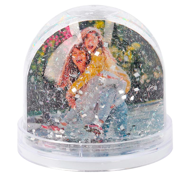 Bola de nieve personalizada con foto y purpurina plateada. Un detalle brillante para regalar y conservar momentos inolvidables.