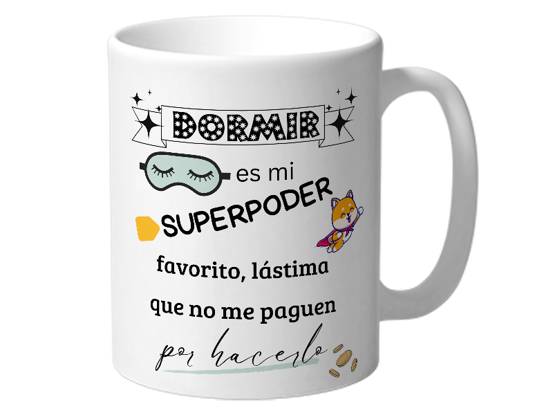 Taza divertida con frase “Dormir es mi superpoder, lástima que no me paguen por hacerlo”. Perfecta para dormilones.