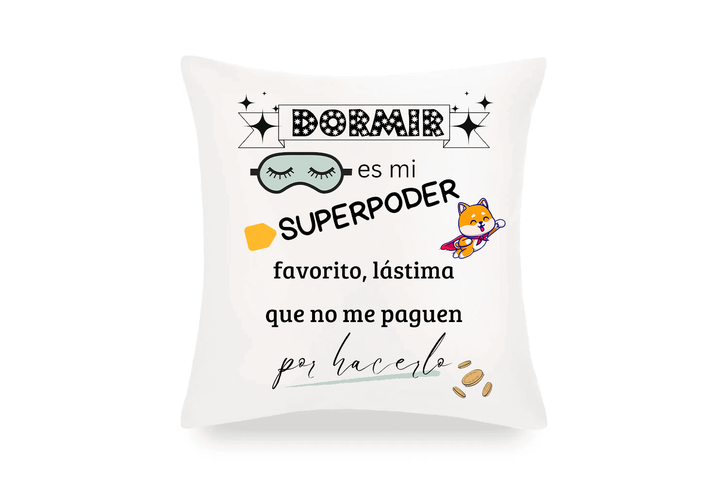 Cojín divertido “Dormir es mi superpoder” – Ideal para amantes de la siesta y el buen humor.