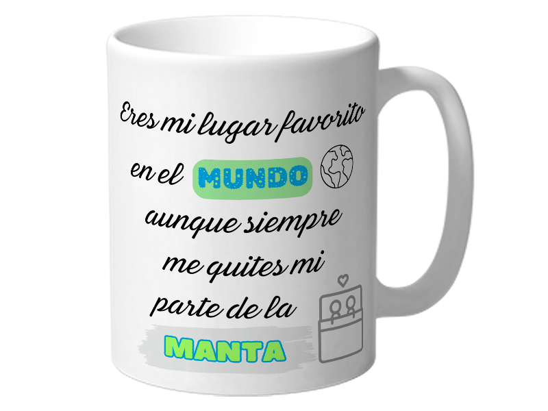 ¿Tu pareja siempre te roba la manta pero aún así no la cambiarías por nada? 🥶❤️ Esta taza con el mensaje «Eres mi lugar favorito en el mundo aunque siempre me quites mi parte de la manta«, es el regalo perfecto para esos amores que sobreviven a las noches frías y a las peleas por la manta. Con un diseño divertido y romántico, es ideal para San Valentín, aniversarios o simplemente para recordarle cada mañana que, a pesar de todo, sigue siendo tu lugar favorito en el mundo. Fabricada en cerámica de alta calidad, resistente al microondas y al lavavajillas, esta taza combina humor y ternura, convirtiéndose en el detalle perfecto para empezar el día con una sonrisa (y con café calentito, que también ayuda 😜).