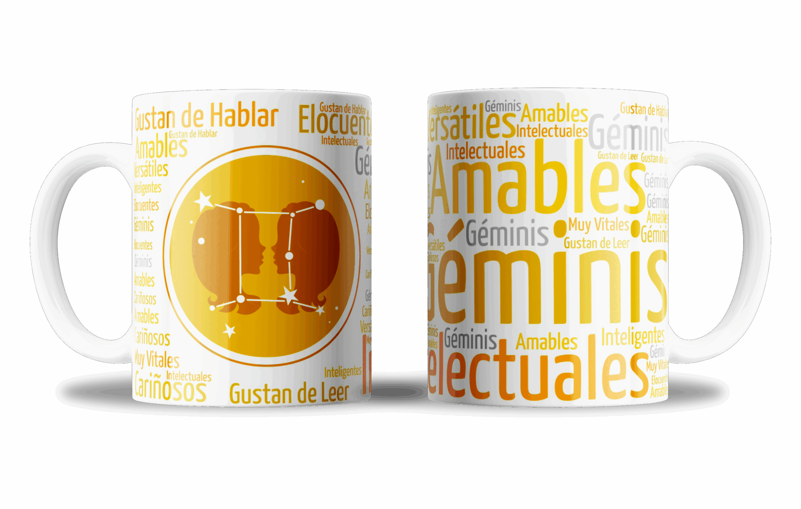 La taza personalizada de Géminis representa perfectamente la energía, el ingenio y la dualidad que caracterizan a este signo del zodiaco. Con un diseño vibrante en tonos amarillos y naranjas, incluye palabras clave como “versátiles”, “amables”, “intelectuales” y “gustan de hablar”, reflejando el carácter curioso, sociable y expresivo de los nacidos entre el 21 de mayo y el 20 de junio. En el centro, destaca la silueta de los gemelos con su constelación, aportando un toque místico y personal. Fabricada en cerámica de alta calidad, esta taza es resistente al uso diario, apta para microondas y lavavajillas. Es el regalo perfecto para cumpleaños, detalles personalizados o simplemente para que un Géminis disfrute su bebida favorita con estilo y autenticidad.