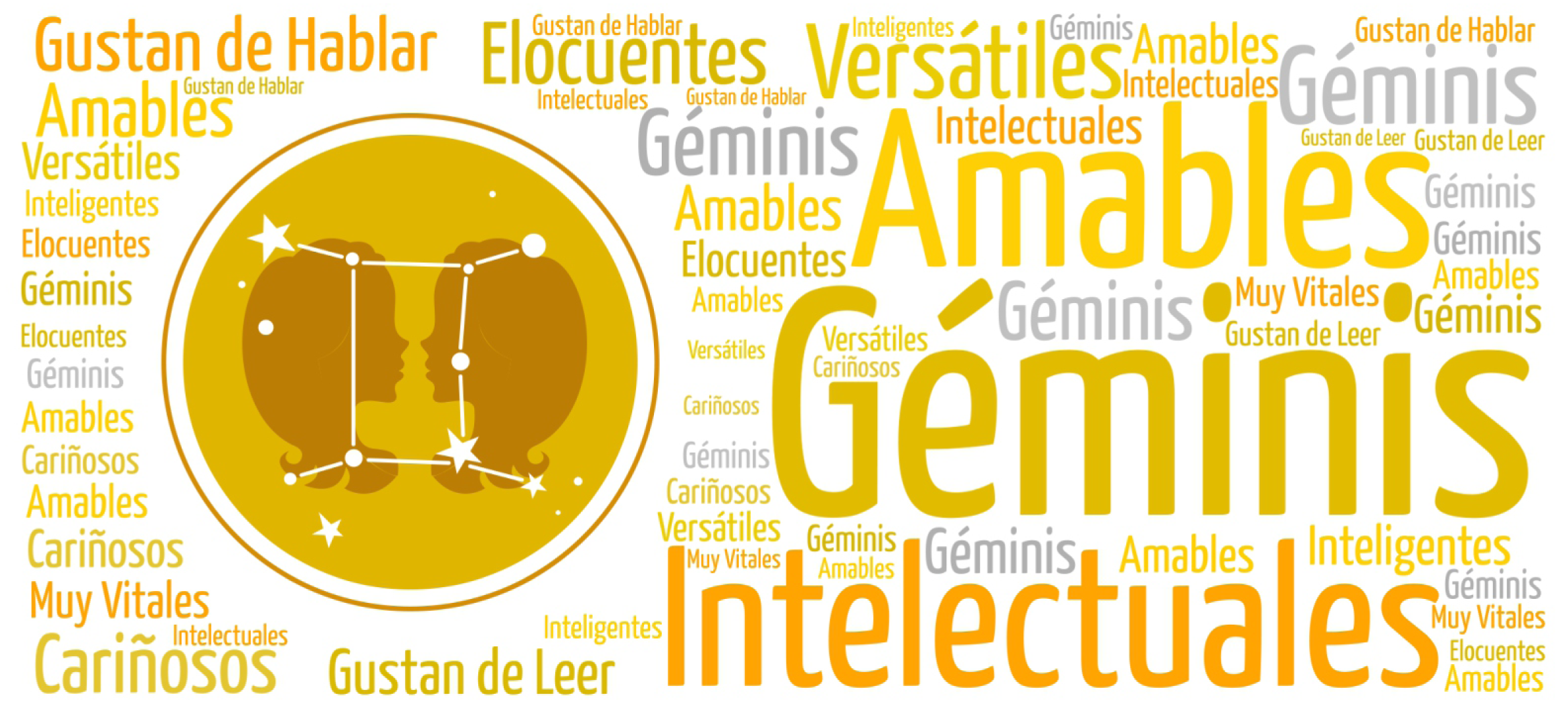 Taza personalizada del signo Géminis con diseño alegre y palabras como versátil, amable e intelectual. Un regalo ideal para los más comunicativos del zodiaco.